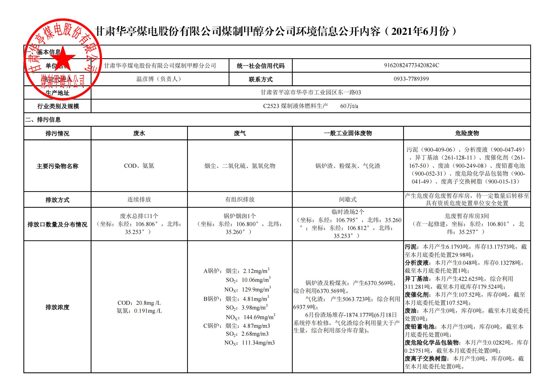 煤制甲醇分公司環(huán)境信息公開(kāi)內(nèi)容(2021年06月)